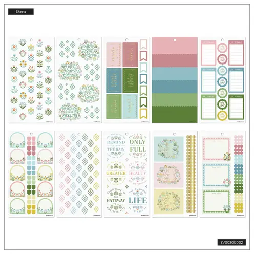 let your heart be light, only full, celebrate today, important, urgent, remember, take note, appointment, meeting, celebrate, be kind, take heart, today is the day, make room for delight, a grateful heart is a magnet for miracles, beauty is all around, allow room to grow, life blooms from within, peace blooms from within, find the good, choose to shine, good day, embrace the good, full of gratitude, attitude of gratitude, happy, life, gateway to a positive life, greater beauty, good things grow here, let it grow, enjoy the beauty of today, this beautiful life, good time, enjoy the now, this is your year, today is yours, be bold and brave, remind me why I started, feel the sun, find joy in the ordinary, go for it, you've got this, find joy, be kind, be good, share love, joy, floral, flowers, plants, greenery, soft florals, modern florals, wildflowers, vine, wreath, bouquet, leaves, soft color palette, pastel pink, light green, sage, butter yellow, dusty blue, gold foil, arched box, oval box, diamond box, full box, half box, long box, small label, bullet point, tracker, habit tracker, checklist, banner, flag, page tab, washi strip, border sticker, sidebar, scallop sticker, decorative floral sheet, floral icons, quote stickers, script font, mini icon dots, reminder strip, label box, celebrate box, meeting box, floral grid, spring, growth